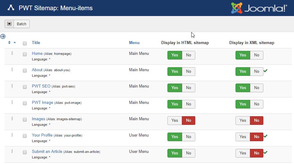 PWT Sitemap allows you to create a sitemap of all available menu items. It also allows you to extend this sitemap with plugins. With the help of these plugins it is possible to include articles in the sitemap or to include items from third party extensions.