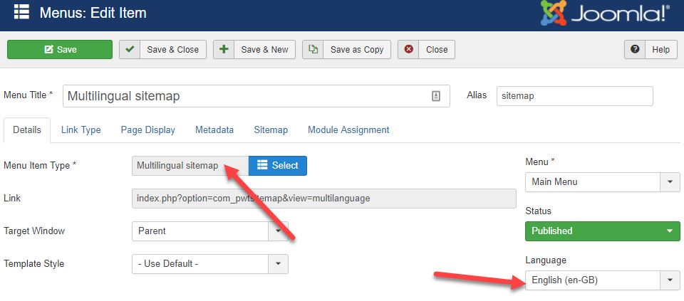 The sitemap supports multi-language websites. Only menu items of current language are displayed in the sitemap. You can create a sitemap for a specific language by simply changing the menu item parameter Language to the preferred language: