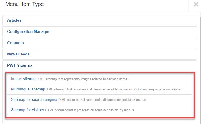 After installing PWT Sitemap the plugins are already enabled. You can create a sitemap by creating a new menu item in a menu of your choose. There are three menu types available: